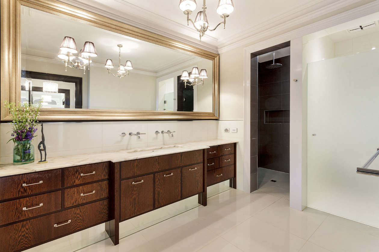 The bespoke kitchen featured honed marble benchtops and shaker cabinets with antique mirror inserts. High quality parquetry flooring and feature skirtings, architraves, wall panelling and cornices complemented the period feel.